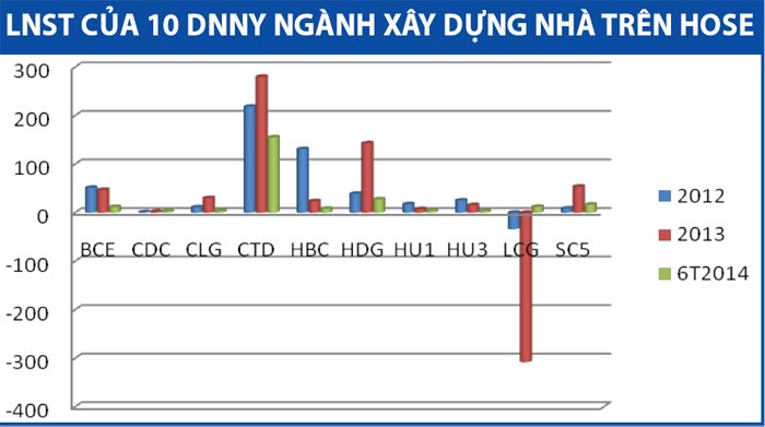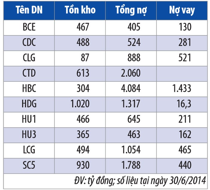 Tuy nhiên, DN trong ngành vẫn còn đối mặt gánh nặng hàng tồn kho và tình trạng thiếu vốn. Tính đến cuối quý II/2014, lượng hàng tồn kho của 10 DN ngành xây dựng nhà niêm yết trên HOSE đạt 5.234 tỷ đồng, nợ vay xấp xỉ 3.660 tỷ đồng. Trong đó, HBC có nợ vay lớn nhất là 1.433 tỷ đồng; HDG có lượng hàng tồn kho lớn nhất, đạt 1.020 tỷ đồng.