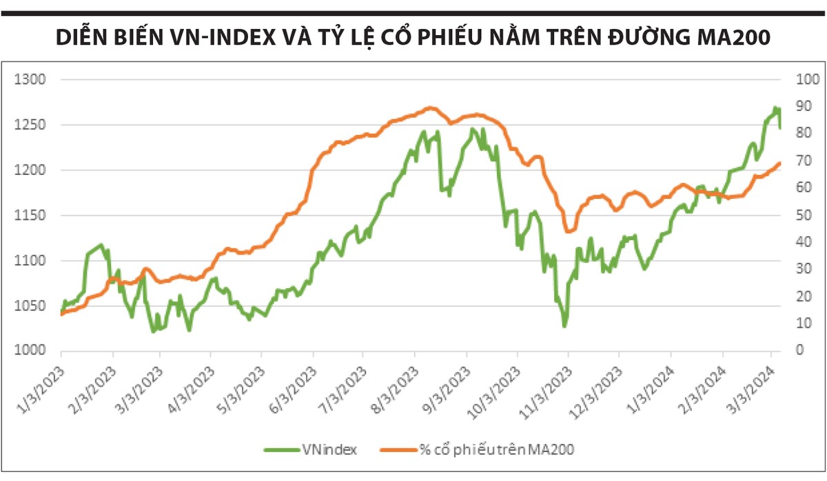 Thị trường điều chỉnh là diễn biến cần thiết để “thay máu” dòng tiền, qua đó thiết lập lại xu hướng tăng. Điểm tích cực là độ rộng thị trường được cải thiện đáng kể sau khi VN-Index vượt đỉnh ngắn hạn, thống kê trên sàn HOSE hiện có gần 70% cổ phiếu nằm trên đường trung bình 200 ngày (MA200). Về mặt kỹ thuật, đây là con số thể hiện VN-Index đang bước vào trạng thái thị trường tăng giá (Bull market).