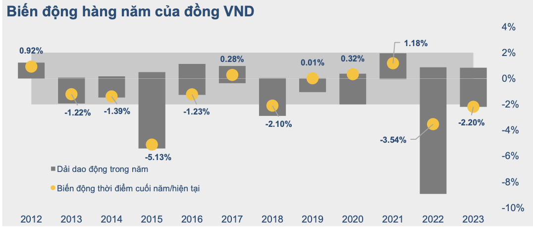 Nhưng với áp lực từ đồng USD không lớn như năm 2022, nhóm phân tích đánh giá rủi ro với tỷ giá sẽ không mạnh như giai đoạn cuối năm ngoái. Việc giảm giá của đồng VND, theo quan điểm của BVSC có thể còn hỗ trợ cho xuất khẩu hàng hóa trong các tháng còn lại của năm.
