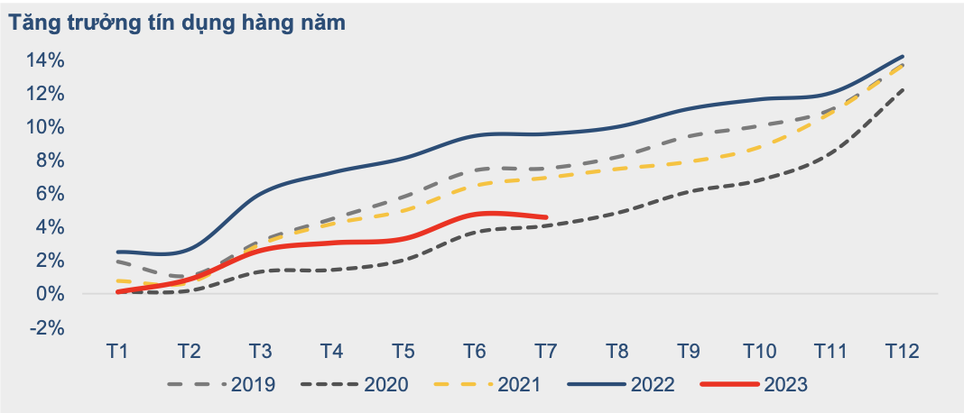Dù mặt bằng lãi suất đang được hạ, nhưng tăng trưởng tín dụng vẫn diễn ra rất chậm. Theo thông tin từ NHNN, tới cuối tháng 7, tăng trưởng tín dụng ghi nhận ở mức 4,56%, thấp hơn mức 4,73% vào cuối tháng 6. Diễn biến này làm tăng thêm áp lực giảm lãi suất để hỗ trợ tăng trưởng tín dụng và qua đó hỗ trợ tăng trưởng kinh tế trong các tháng còn lại của năm.