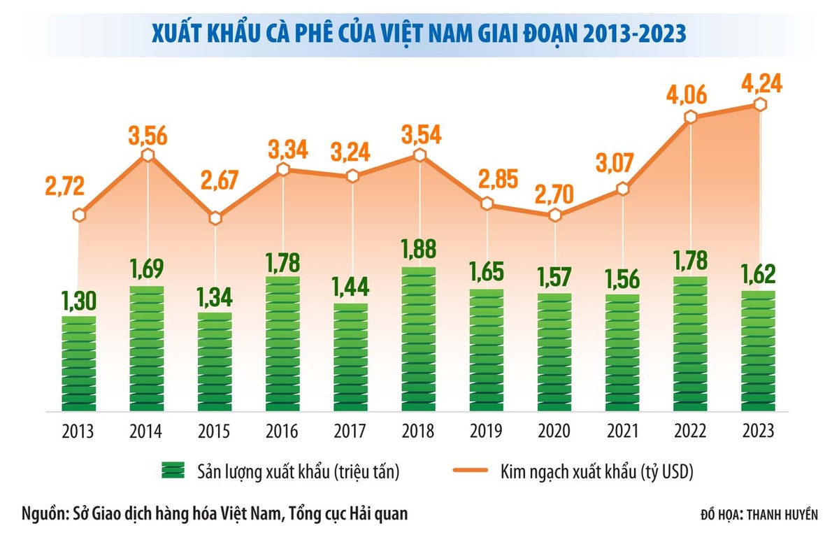 Việt Nam là nước xuất khẩu cà phê lớn thứ hai thế giới và là quốc gia đứng đầu về sản lượng cà phê robusta. Trong vòng 10 năm trở lại đây, cà phê luôn nằm trong nhóm nông sản xuất khẩu chủ lực của Việt Nam, đem về hàng tỷ USD mỗi năm.