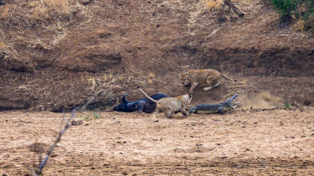 Theo như ghi nhận của chị Rosa, khi đến đây, đập vào mắt chị là hình ảnh hai con sư tử cái và con của chúng đã túm cổ được một con trâu rừng. Trong lúc đàn sư tử đang tận hưởng "hương vị" của chiến thắng thì bất ngờ dưới lòng sông xuất hiện một con cá sấu khổng lồ.
