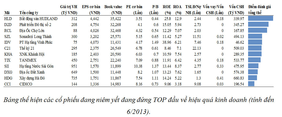 CTCP Đầu tư và Phát triển BĐS HUDLAND (HNX) trong bảng đánh giá ở trên có mức điểm tổng quan đánh giá hiệu quả kinh doanh cao nhất, và gần gấp 2 lần mức điểm bình quân của 12 cổ phiếu trong bảng. HLD là cổ phiếu có EPS (chưa pha loãng) cao nhất, giá trị sổ sách lớn nhất, ROA cao nhất trong khi P/E và P/B thấp nhất.