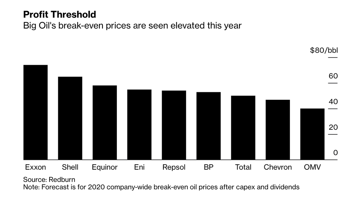 Điểm hoà vốn của các nhà sản xuất dầu mỏ lớn năm 2020