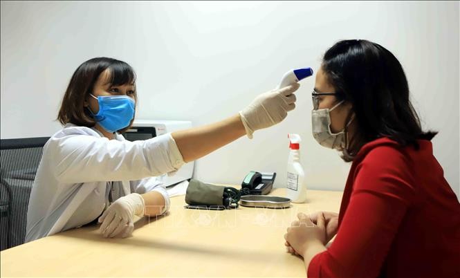 Đo nhiệt độ cho công nhân tại phòng y tế Công ty TNHH sản xuất hàng may mặc Việt Nam (TAL), khu công nghiệp Bá Thiện 2 (huyện Bình Xuyên). Ảnh: Hoàng Hùng - TTXVN