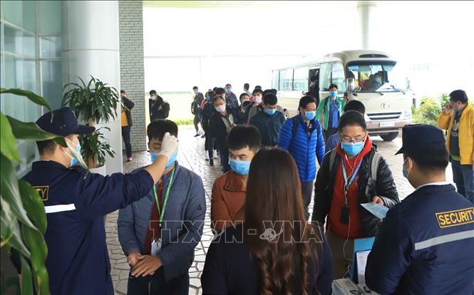 Trong ảnh: Đo nhiệt độ cho công nhân trước khi vào làm việc tại Công ty TNHH sản xuất hàng may mặc Việt Nam (TAL), khu công nghiệp Bá Thiện 2 (huyện Bình Xuyên). Ảnh: Hoàng Hùng - TTXVN