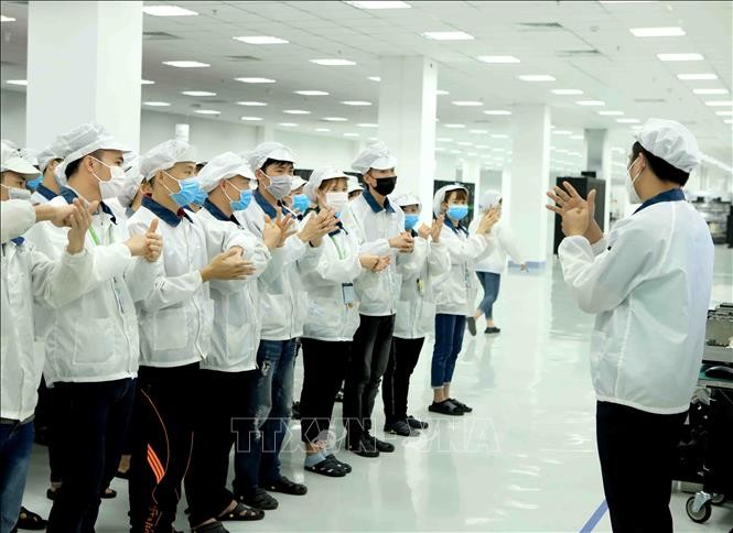 Tất cả công nhân, cán bộ, khách hàng đến làm việc tại Công ty TNHH Compal Việt Nam trong khu công nghiệp Bá Thiện 1 (huyện Bình Xuyên) đều đeo khẩu trang mới, đi qua khay dung dịch khử khuẩn, sát khuẩn tay và đo nhiệt độ để phòng chống dịch COVID-19. Ảnh: Hoàng Hùng - TTXVN