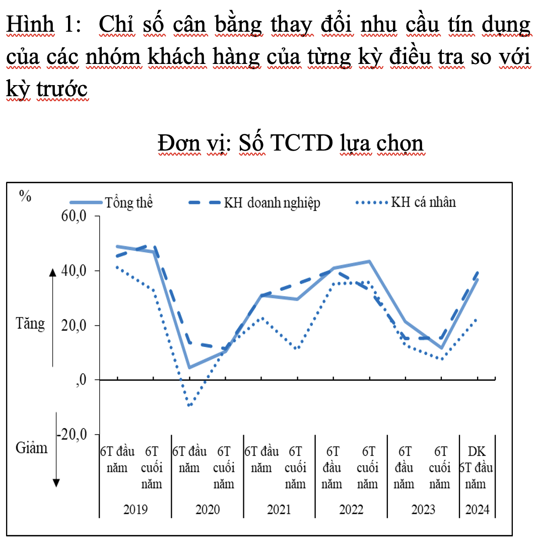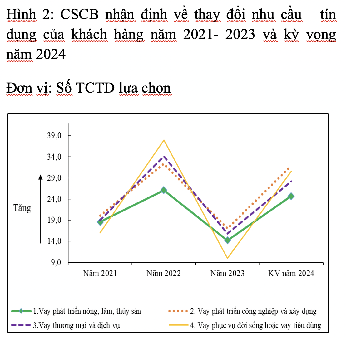 Ngoài ra, trong 6 tháng đầu năm 2024, các TCTD dự kiến giữ ổn định các điều kiện và điều khoản cho vay tổng thể đối với khách hàng doanh nghiệp và nới lỏng hơn đối với khách hàng cá nhân (dự kiến áp dụng đối với lĩnh vực vay phục vụ đời sống, vay mua bất động sản để ở).
