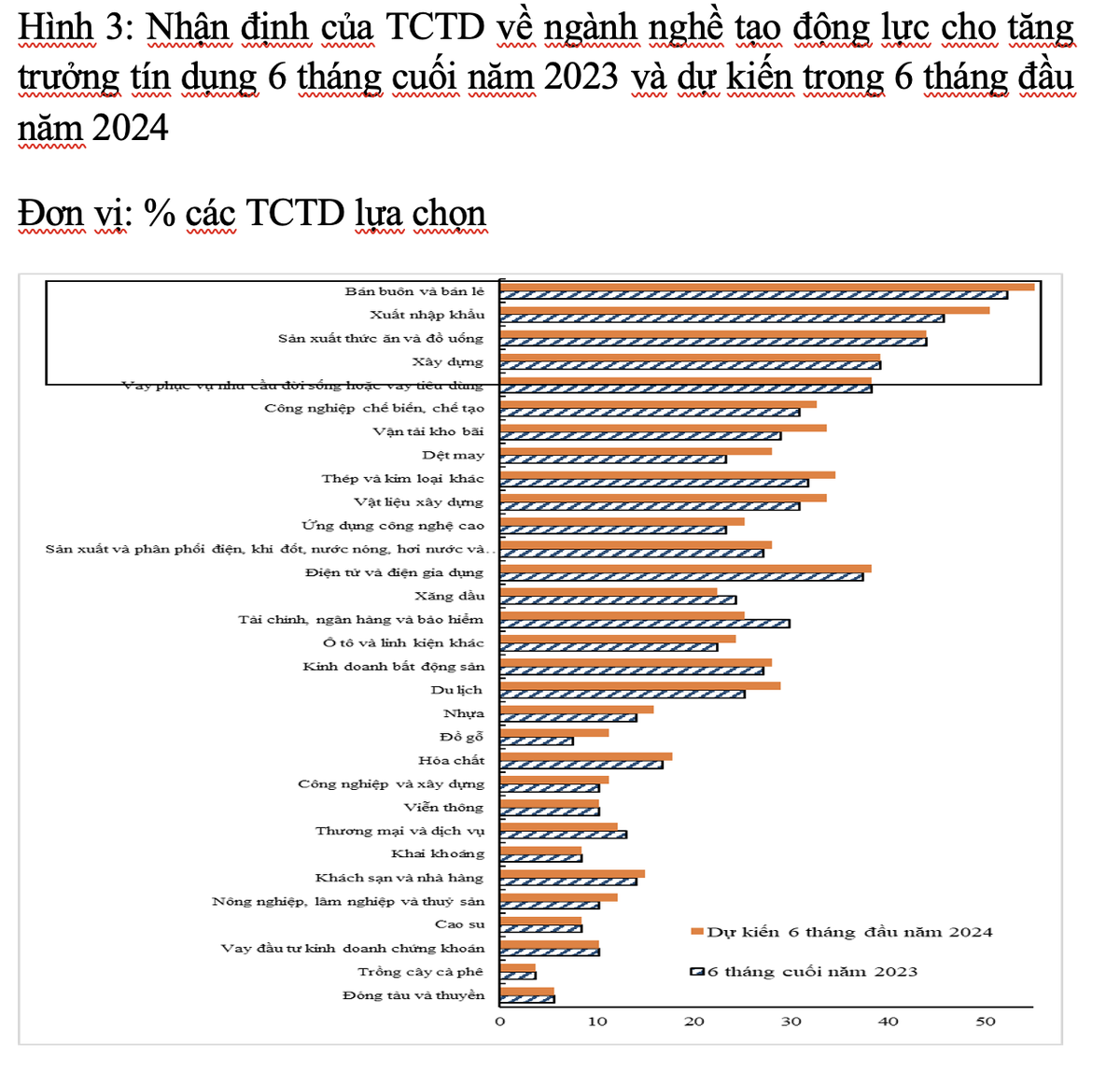 Chuyển sang 6 tháng đầu năm và cả năm 2024, 70,3-73,3% TCTD dự kiến tiếp tục giữ nguyên “không đổi” hoặc “nới lỏng” nhẹ tiêu chuẩn tín dụng tổng thể của đơn vị mình (13,9-16,8% TCTD dự kiến “nới lỏng” tiêu chuẩn tín dụng, 12,9% TCTD dự kiến “thắt chặt” nhẹ tiêu chuẩn tín dụng), trong đó, dự kiến “nới lỏng” nhẹ tiêu chuẩn tín dụng đối với tất cả các lĩnh vực ưu tiên và “Công nghiệp chế biến chế tạo”, “Cho vay đầu tư ngành dịch vụ logistics” và “Cho vay mua nhà để ở”.