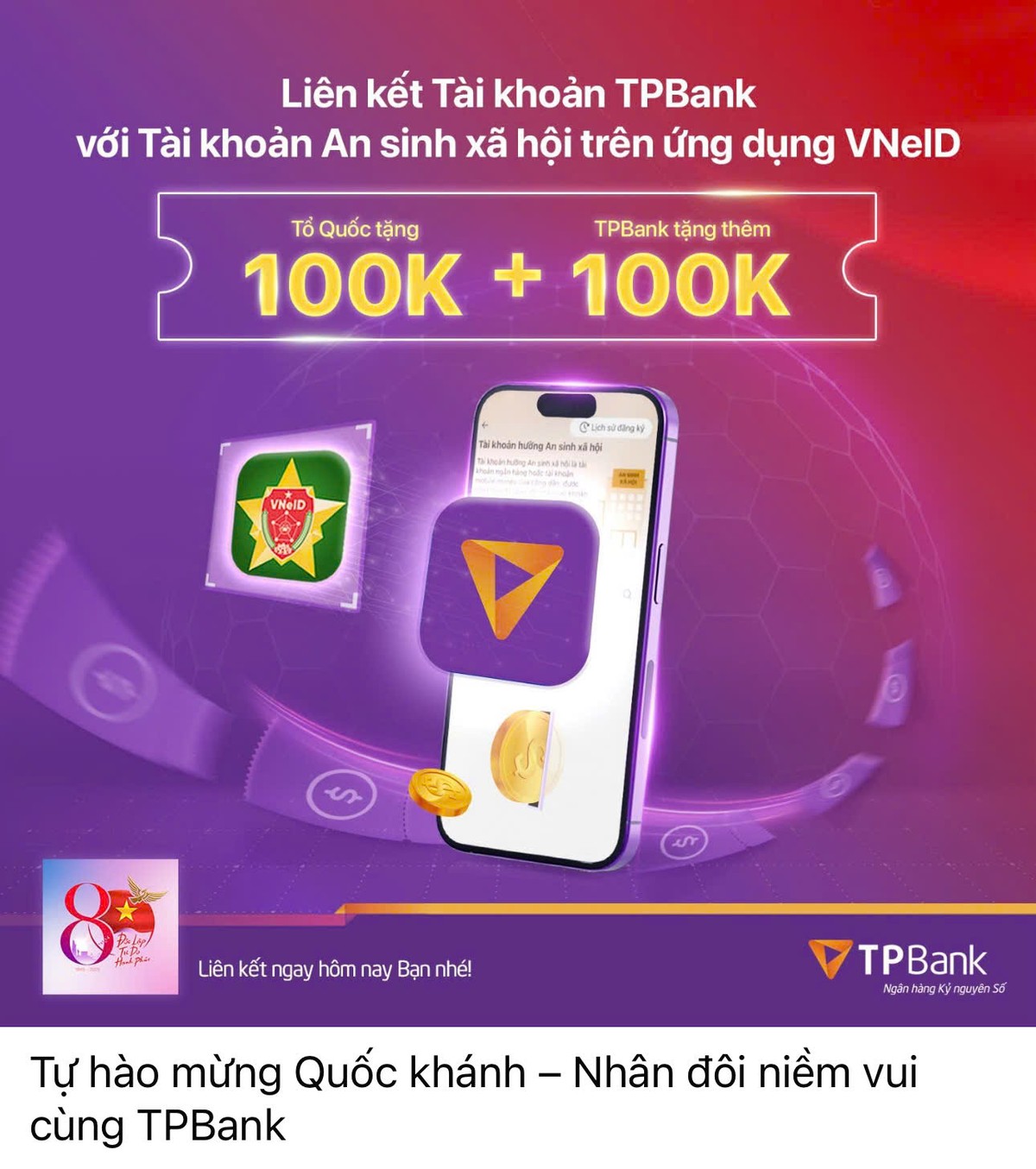 Trước đó, TPBank là ngân hàng đầu tiên công bố thông tin chương trình khuyến mãi tặng ngay 100.000 đồng cho 2.980 khách hàng đầu tiên thực hiện liên kết thành công. Riêng với cán bộ nhân viên của TPBank, ngân hàng áp dụng ưu đãi cho 200 người đầu tiên tham gia chương trình. Chương trình được áp dụng trên phạm vi toàn quốc từ ngày 29/8 đến ngày 30/9.