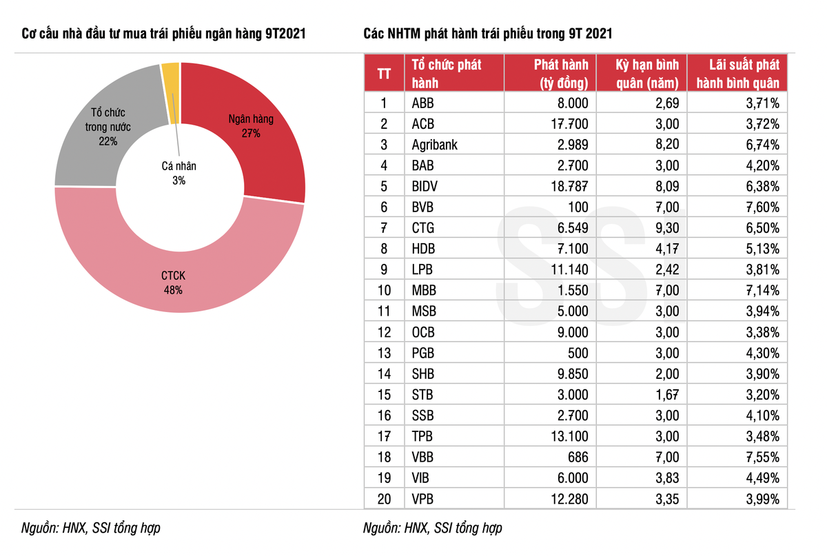 Trong quý III, khối lượng trái phiếu ngân hàng phát hành thành công đạt 65,2 nghìn tỷ đồng, giảm 6,8% so với quý 2 nhưng tăng tới 37,9% so với cùng kỳ. Tính chung 9 tháng đầu năm 2021, có 20 NHTM phát hành 136,4 nghìn tỷ đồng (tăng 42,6% so với cùng kỳ) trái phiếu với kỳ hạn bình quân 4,13 năm và lãi suất bình quân 4,5%/năm.