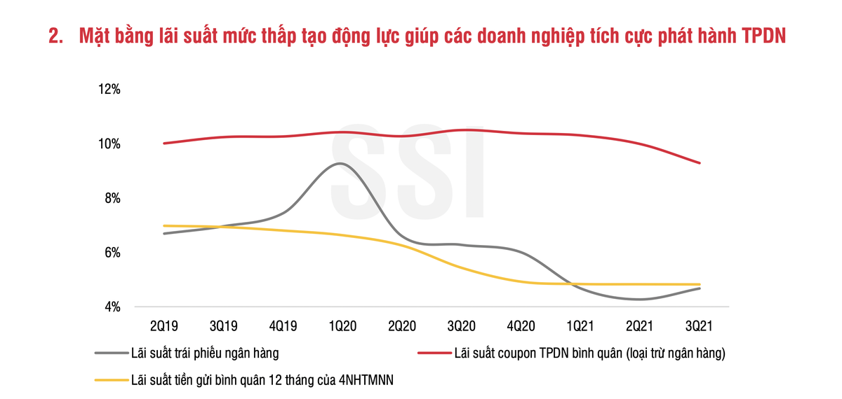 Bên cạnh đó, nhu cầu đầu tư trái phiếu doanh nghiệp từ các nhà đầu tư cá nhân vẫn duy trì tích cực khi chênh lệch giữa lãi suất phát hành trái phiếu doanh nghiệp và lãi suất tiền gửi giữ ở mức cao.