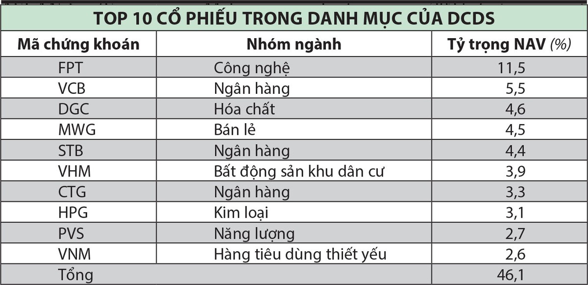 Tính theo nhóm ngành, DCDS đang rót 22,8% vốn vào cổ phiếu ngân hàng, tiếp theo là nhóm bất động sản dân cư và công nghệ. Tuy nhiên, cổ phiếu chiếm tỷ trọng lớn nhất là FPT (11,5%), nhóm ngân hàng có 3 cổ phiếu bao gồm VCB (5,5%), STB (4,4%), CTG (3,3%).