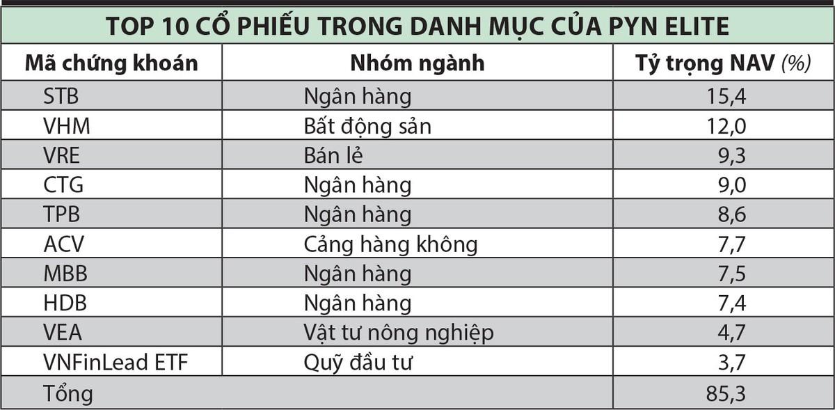Top 10 cổ phiếu chiếm tỷ trọng lớn nhất trong danh mục của PYN Elite có một nửa là các ngân hàng, bao gồm STB (15,4%), CTG (9%), TPB (8,6%), MBB (7,5%), HDB (7,4%), chưa kể PYN Elite nắm giữ chứng chỉ quỹ VNFin Lead ETF (đầu tư chủ yếu vào cổ phiếu ngân hàng). Một số cổ phiếu khác có tỷ trọng cao trong danh mục của Quỹ là VHM (12%), VRE (9,3%)…