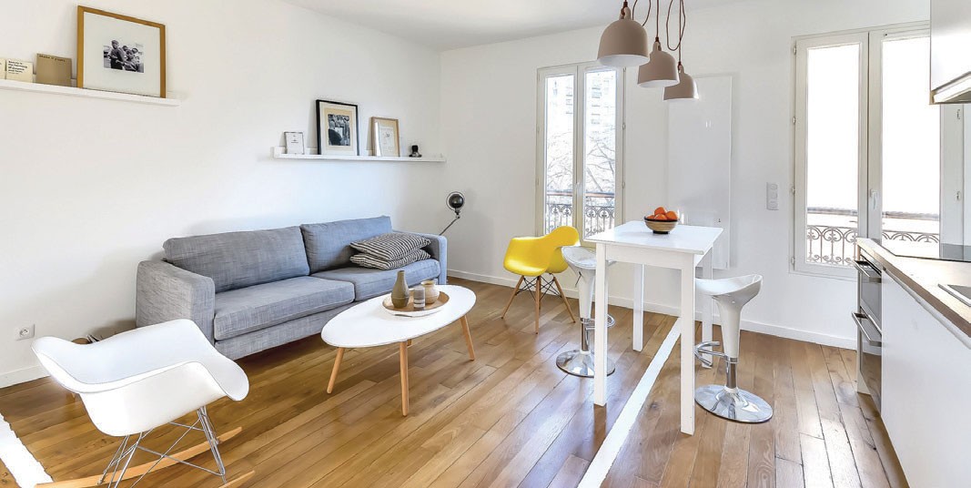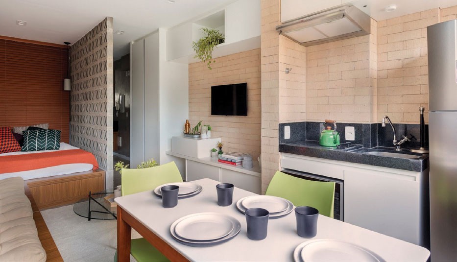 Nhưng hài hòa đến mức nào thì tùy không gian từng ngôi nhà. Căn hộ xinh xắn cần được bố trí thật căn bản, tận dụng không gian phòng khách liền khu vực nấu nướng gọn gàng với bàn ăn đủ rộng cho gia đình 3-4 người. Phòng ngủ chính được ngăn với phòng khách bằng hệ thống cửa trượt dạng kín, mở. Khi cần có thể bung nới không gian với phòng khách.