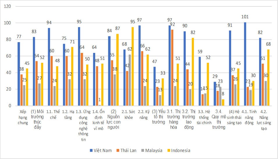 So sánh về năng lực cạnh tranh 4.0 với một số nước xung quanh, thì nước ta thua kém rất xa và toàn diện so với các nước như Thái Lan, Indonesia, Malaysia (xem biểu đồ).