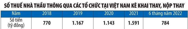 Số liệu của Tổng cục Thuế cho thấy, giai đoạn từ năm 2018 đến hết tháng 6/2022, số thu thuế đối với hàng hóa, dịch vụ xuyên biên giới thông qua các tổ chức tại Việt Nam khai thay, nộp thay thuế nhà thầu đạt 5.432 tỷ đồng. Trong đó, các nhà thầu nộp thay Facebook 2.071 tỷ đồng; Google 2.034 tỷ đồng; Microsoft 692 tỷ đồng, TikTok 34,5 tỷ đồng, Netflix 7,8 tỷ đồng…