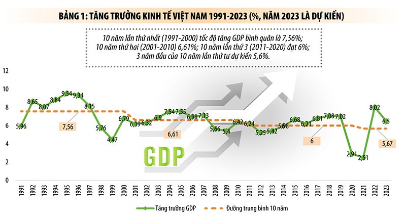 Ở góc độ tăng trưởng, nhìn trong giai đoạn gần 30 năm qua, kinh tế nước ta đang suy giảm nhanh chóng. Cứ 10 năm, tăng trưởng GDP trung bình giảm hơn 0,5 điểm phần trăm (xem bảng 1). Nếu muốn đạt mục tiêu mong muốn trong giai đoạn 2021-2025 khoảng 7%/năm mà Kế hoạch Phát triển kinh tế - xã hội 5 năm 2021-2025 đã đặt ra, thì năm 2024 và 2025 phải đạt mức tăng trưởng trung bình 9%/năm...