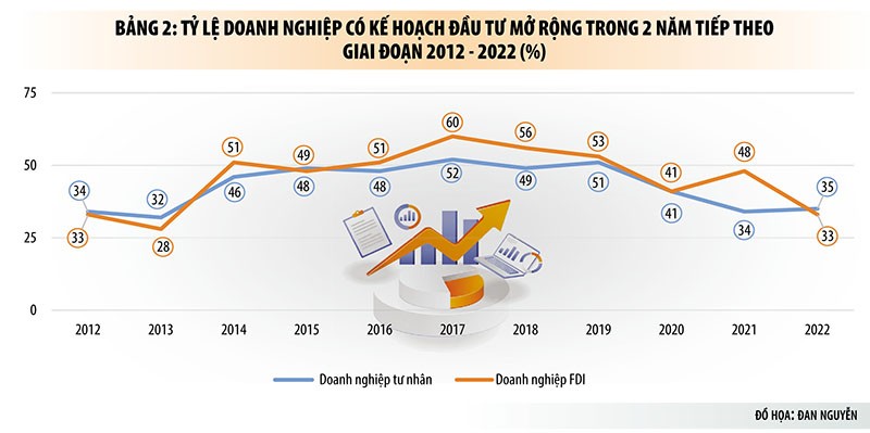 Hậu quả là, các doanh nghiệp có xu hướng trì hoãn đầu tư mở rộng quy mô, ngành nghề kinh doanh. Tỷ lệ số doanh nghiệp (trong nước và FDI) có kế hoạch đầu tư mở rộng trong 2 năm tới đã giảm xuống mức thấp nhất kể từ năm 2014 (xem bảng 2).