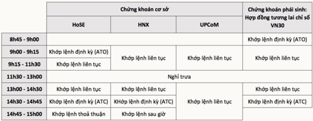 UPCoM chỉ có phương thức khớp lệnh định kỳ suốt phiên từ 9h đến 15h, trừ giờ nghỉ trưa.