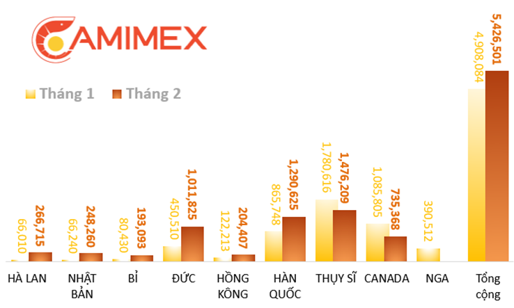 Lũy kế 2 tháng đầu năm, Camimex ghi nhận tổng giá trị xuất khẩu đạt hơn 10 triệu USD.