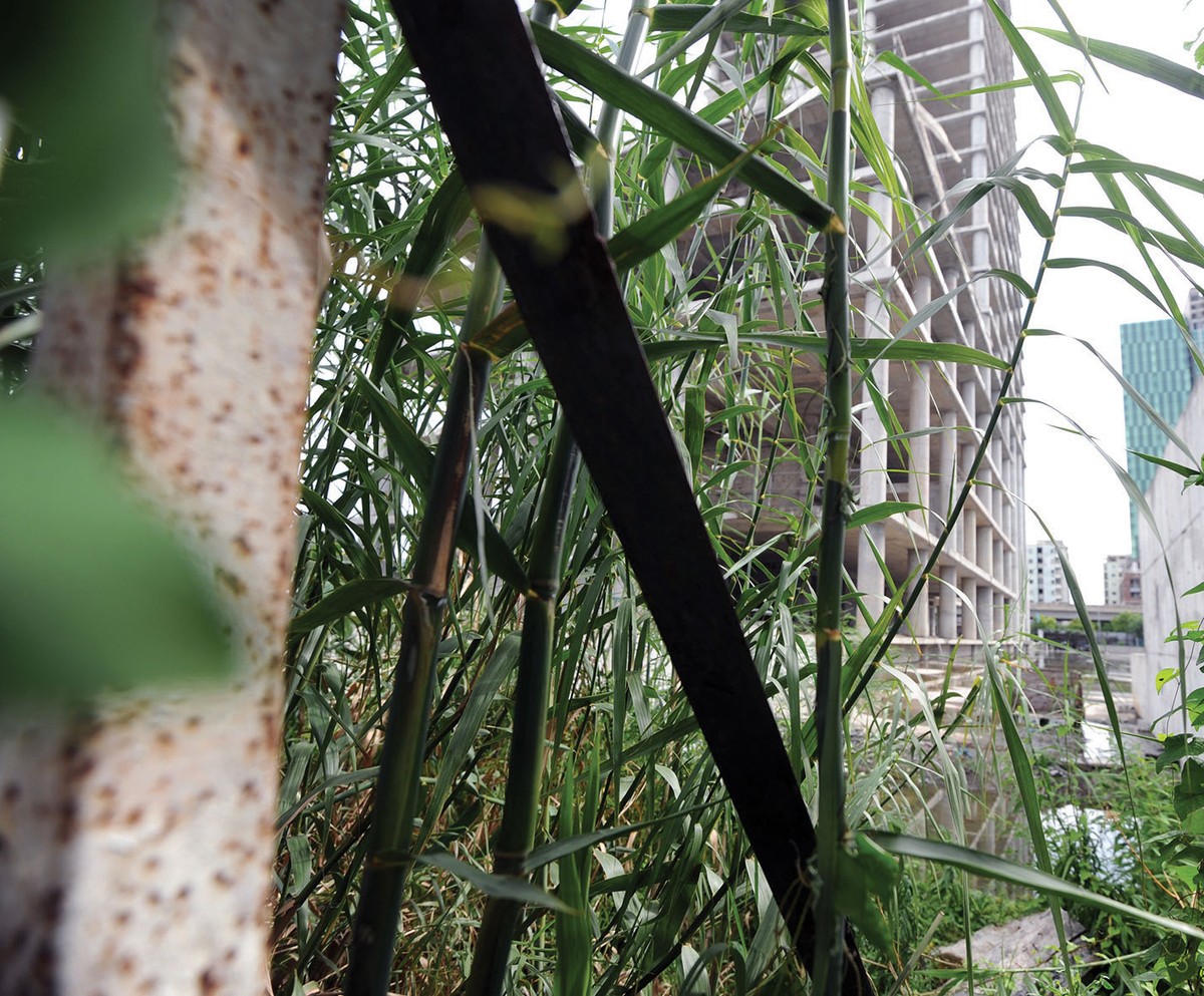 Tuy đã xây dựng xong phần thô, nhưng công trình đang trong giai đoạn ngừng thi công, nhiều chỗ cỏ mọc cao quá đầu người