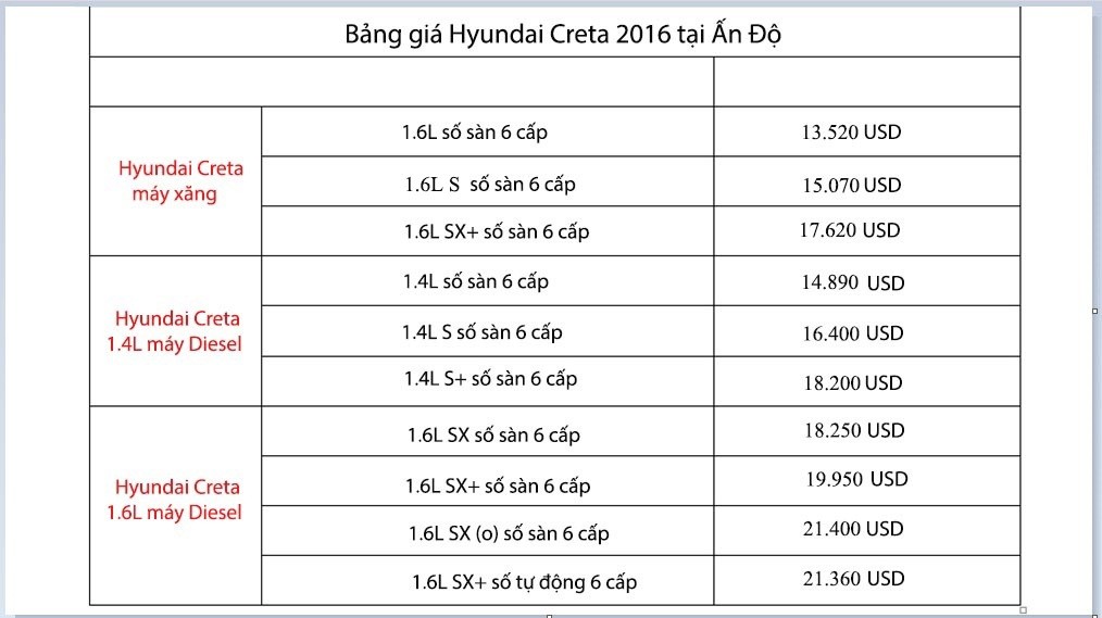 Bảng giá 10 phiên bản của Hyundai Creta 2016 tại Ấn Độ