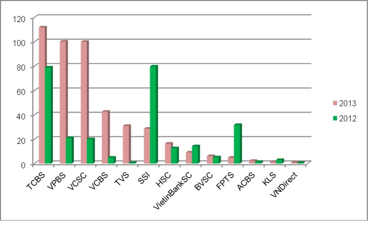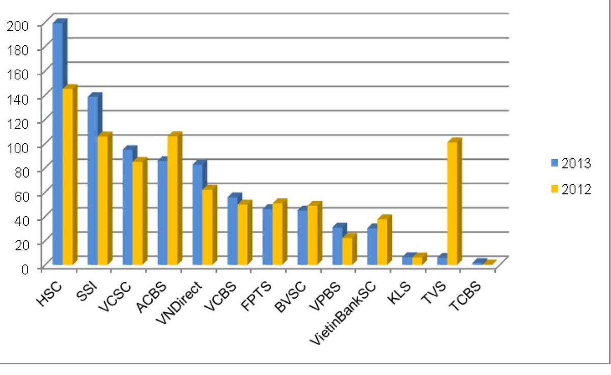Ở chiều ngược lại, lãi tiền gửi ngân hàng giảm 48 tỷ đồng, doanh thu giao dịch ký quỹ giảm 32,3 tỷ đồng và doanh thu repo giảm 33,7 tỷ đồng, từ đó khiến cho tổng “doanh thu khác” trong năm 2013 giảm 110,3 tỷ đồng.