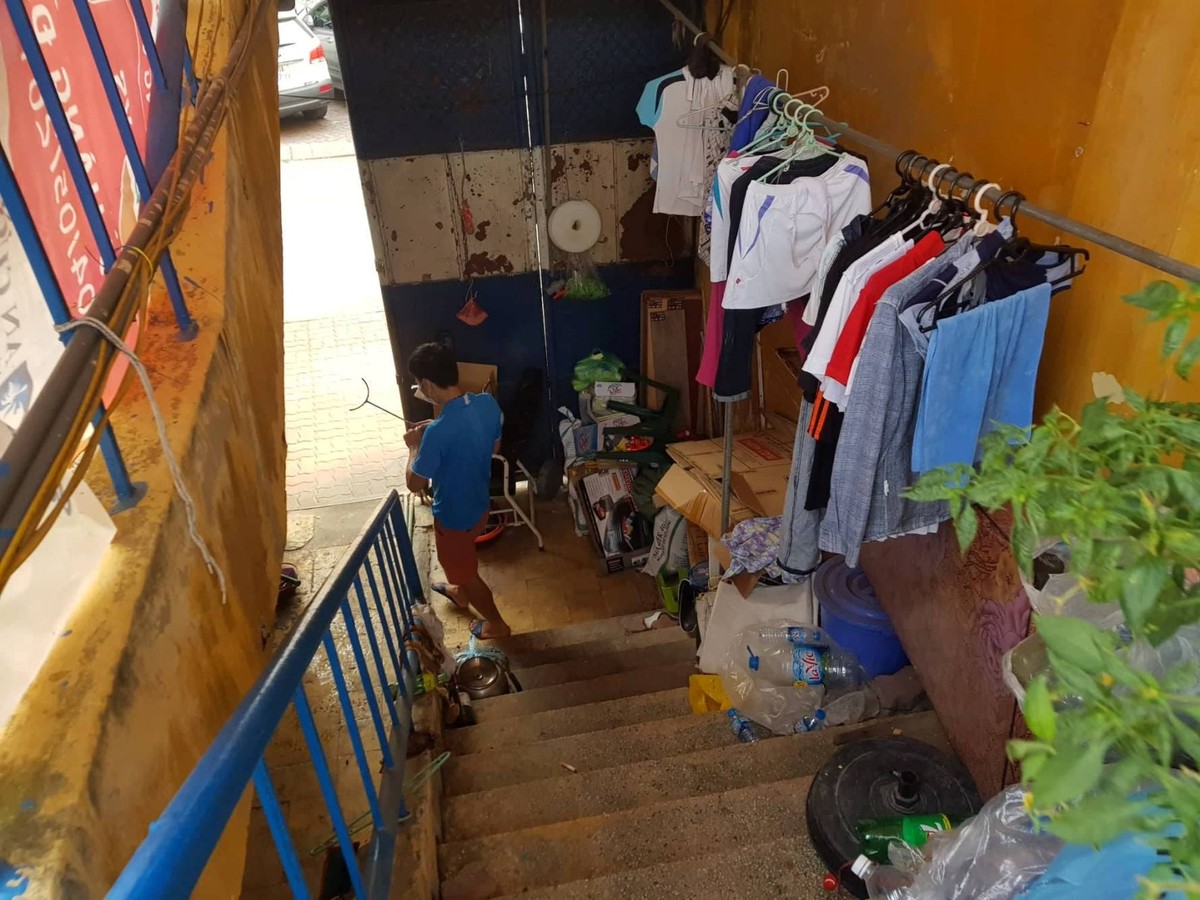 Phía ngoài sân Hàng Đẫy, các tiểu thương thuê lập ki ốt bán đồ thể thao, hàng ăn, quán nước... Nhiều cửa hàng tận dụng không gian chung để đồ rất nhếch nhác.