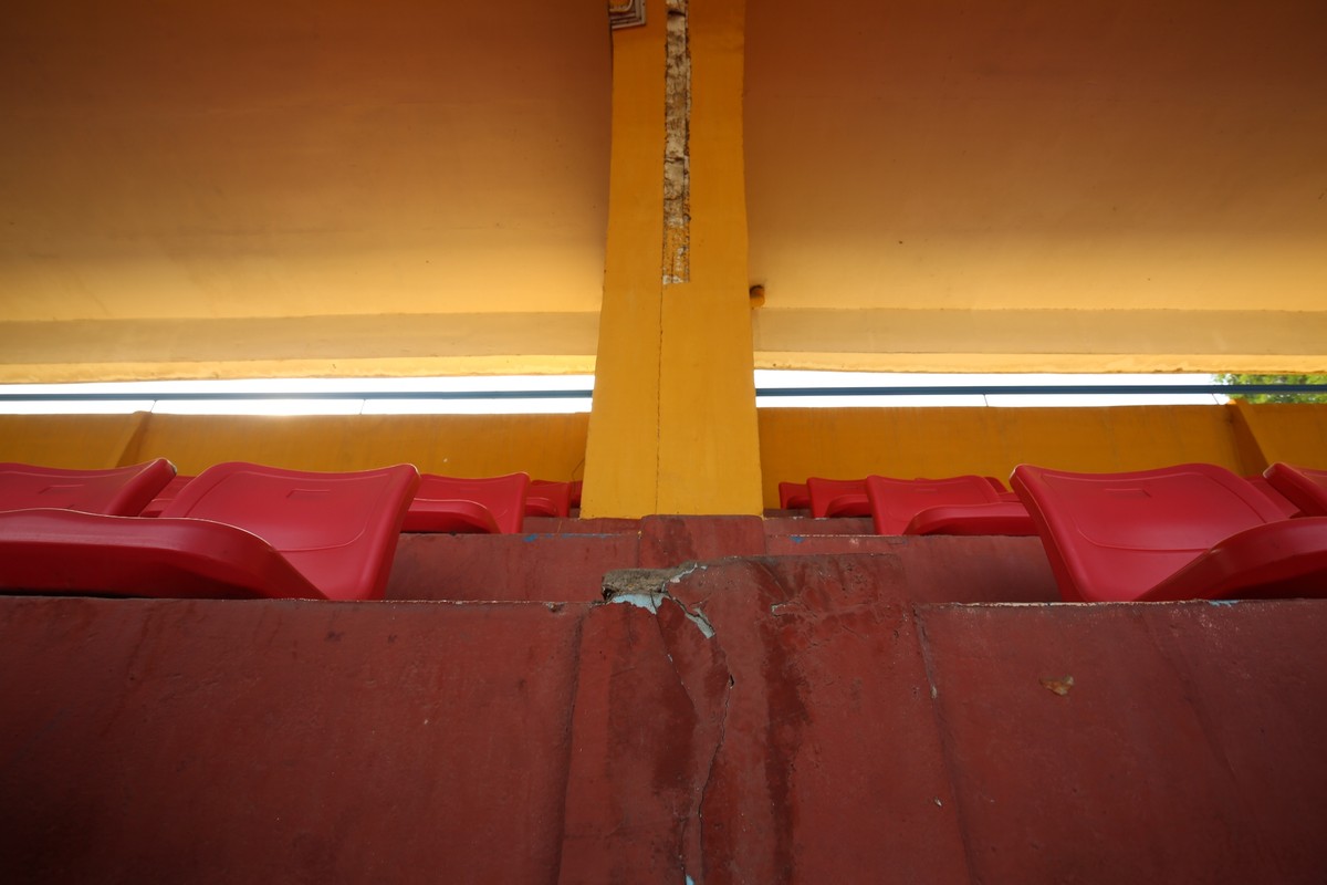 Nhiều khu vực khán đài đã vỡ nát, lộ rõ kết cấu xây dựng.