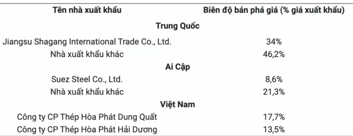 Biên độ bán phá giá của các doanh nghiệp được xác định cụ thể như sau: