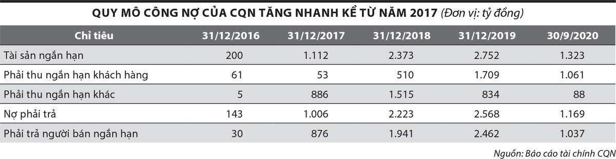 Từ khi mở rộng sang kinh doanh hàng hóa nông sản năm 2016, ngoài các khoản chi phí phát sinh từ các bộ phận, các khoản công nợ gồm phải thu ngắn hạn và phải trả người bán của CQN tăng mạnh qua các năm. Vì thế, quy mô tài sản của CQN tăng nhanh, dù vốn điều lệ giữ nguyên.