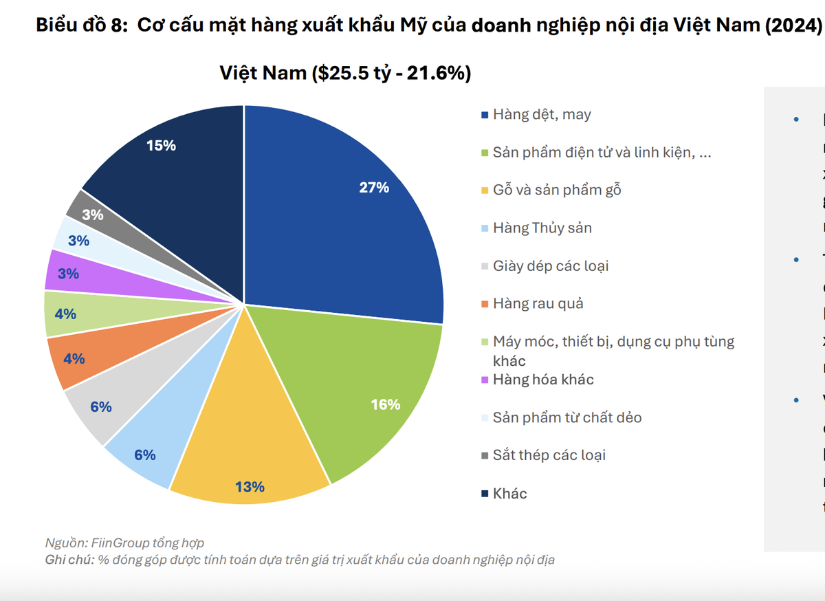 Những ngành hàng như dệt may (27%), gỗ và sản phẩm gỗ (13%), hay thủy sản (6%) – vốn là mũi nhọn xuất khẩu của khối doanh nghiệp nội – lại cũng chính là nhóm chịu tác động trực tiếp khi Mỹ siết chặt các hàng rào thuế quan, kỹ thuật hoặc gia tăng các tiêu chuẩn môi trường.