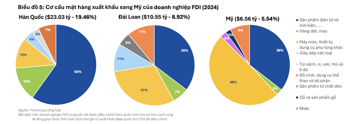 Ví dụ, trong năm 2024, khoảng 60% giá trị xuất khẩu của doanh nghiệp Hàn Quốc tại Việt Nam là sản phẩm điện tử, tỷ lệ này ở doanh nghiệp Đài Loan là 35%, còn với doanh nghiệp Mỹ đầu tư tại Việt Nam, nhóm điện tử và máy móc thiết bị chiếm đến 85%. Điều này phản ánh chiến lược phát triển dài hạn và bài bản của các tập đoàn đa quốc gia, đồng thời cho thấy Việt Nam hiện vẫn chủ yếu đóng vai trò “công xưởng gia công” thay vì là trung tâm sáng tạo công nghệ.