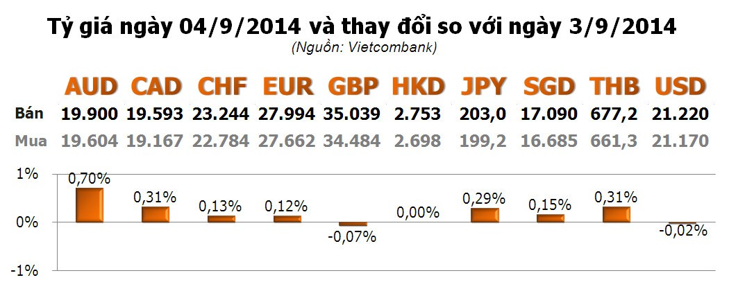 Các ngoại tệ khác đồng loạt tăng sau khi cùng nhau giảm ngày trước đó. Trong đó AUD tăng mạnh nhất với 0,7%; tiếp đến là CAD và THB, cùng tăng 0,31%...