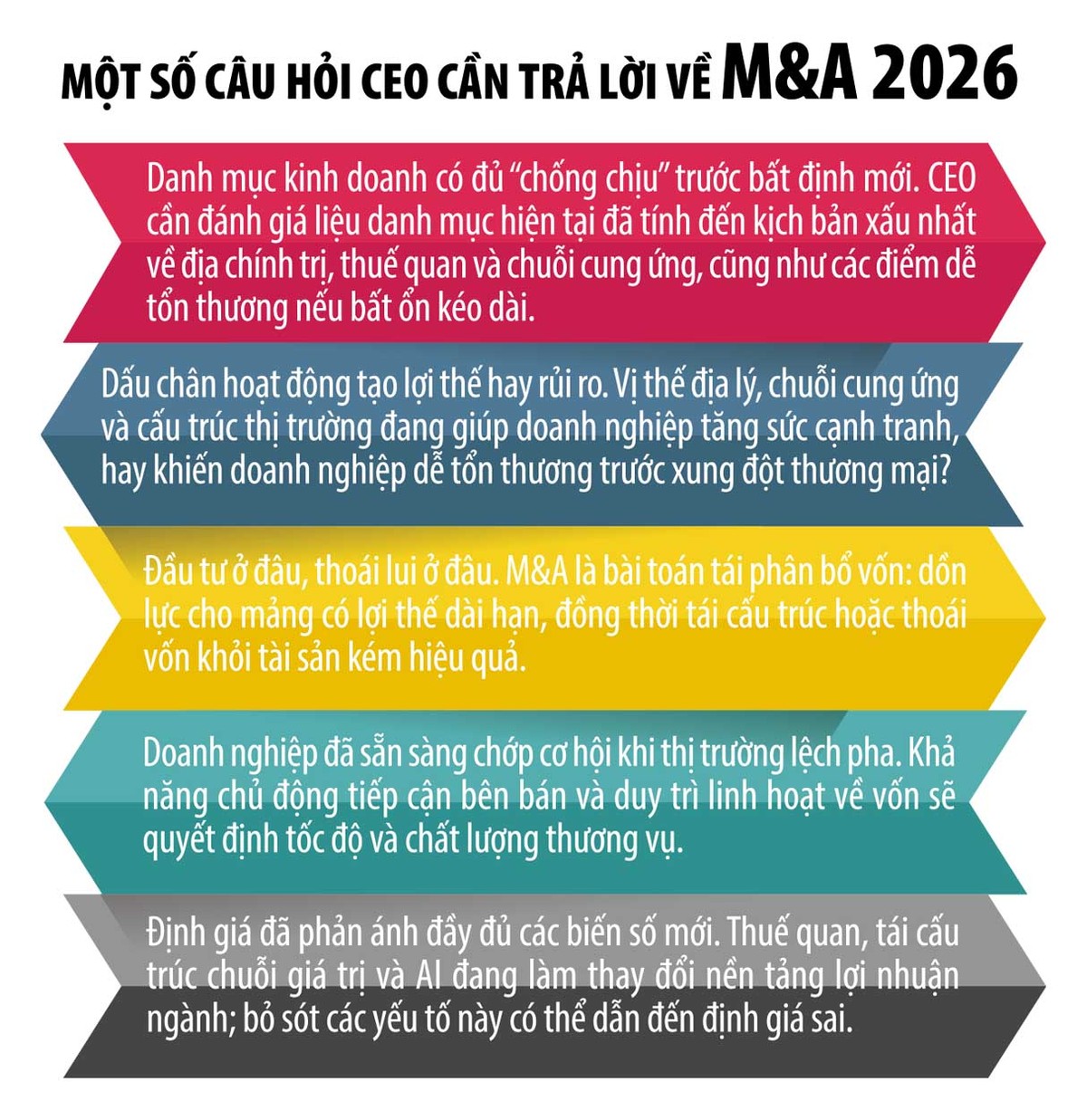 Bước sang năm 2026, nhiều chuyên gia tin rằng, thế giới đang bước vào một chu kỳ M&A mạnh mẽ kéo dài nhiều năm. Các thương vụ trị giá 50-100 tỷ USD đã được chuẩn bị trên bàn, đặc biệt trong lĩnh vực công nghệ.