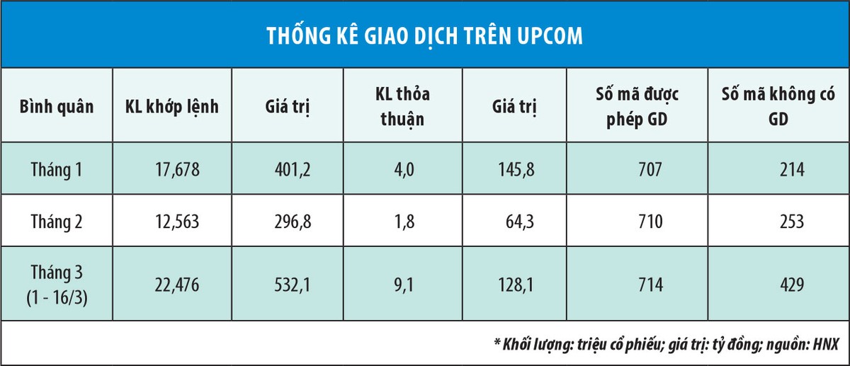 Từ ngày 1 - 16/3, chỉ số UPCoM-Index tăng 2,8%, từ 60,09 điểm lên 61,8 điểm; số mã cổ phiếu tăng giá và giảm giá trong mỗi phiên là tương đương nhau, trung bình có 84 mã tăng giá, 84 mã giảm giá trong tổng số gần 650 mã được phép giao dịch. Trước đó, trong tháng 2, UPCoM-Index tăng hơn 1%.