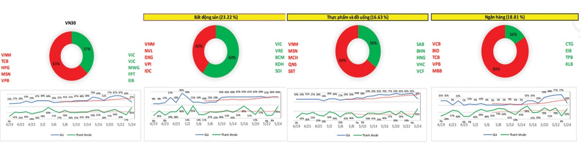 Thị trường chứng kiến sự luân chuyển dòng tiền ở các nhóm cổ phiếu trụ. Trong các phiên đầu tuần qua, dòng tiền có dấu hiệu thoát ra ở nhóm bất động sản (VHM, VIC) và thực phẩm, đồ uống (VNM, MSN). Trong khi đó, nhóm ngân hàng (VCB, TCB, VPB) được kỳ vọng sẽ là điểm đến tiếp theo của dòng tiền, nhưng dòng tiền chưa lan tỏa kịp ở nhóm này, khiến thị trường chung có diễn biến kém khả quan trong các phiên cuối tuần.
