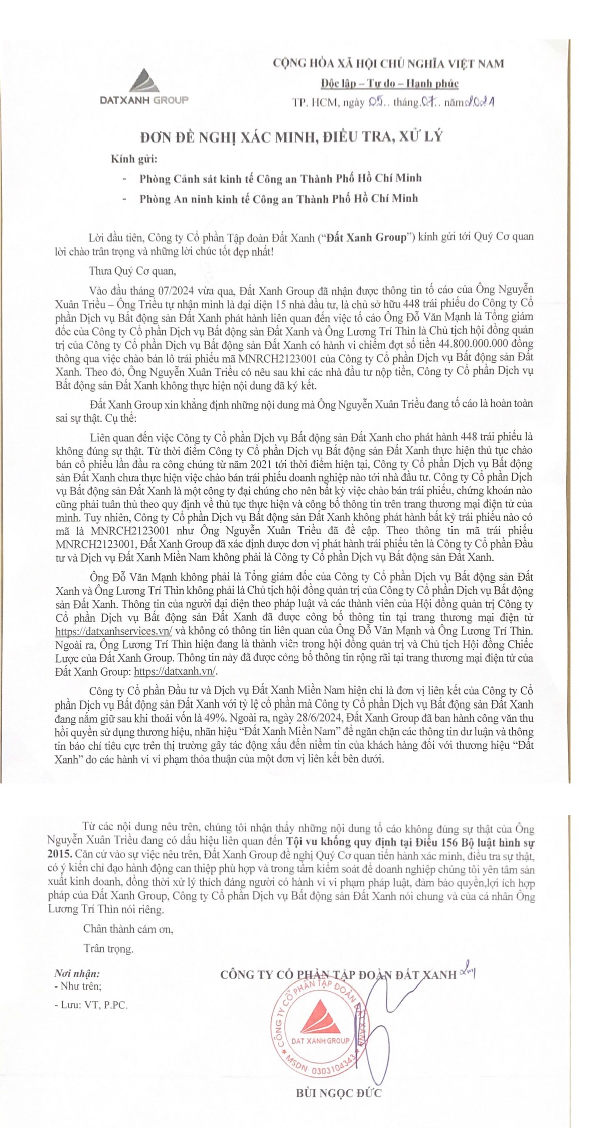 Sau thông tin trên, theo thông tin từ Tập đoàn Đất Xanh, ngày 5/7/2024, Công ty đã có Đơn đề nghị gửi tới Phòng cảnh sát Kinh tế, phòng an ninh kinh tế Công an TP.HCM để xác minh, điều tra, xử lý.