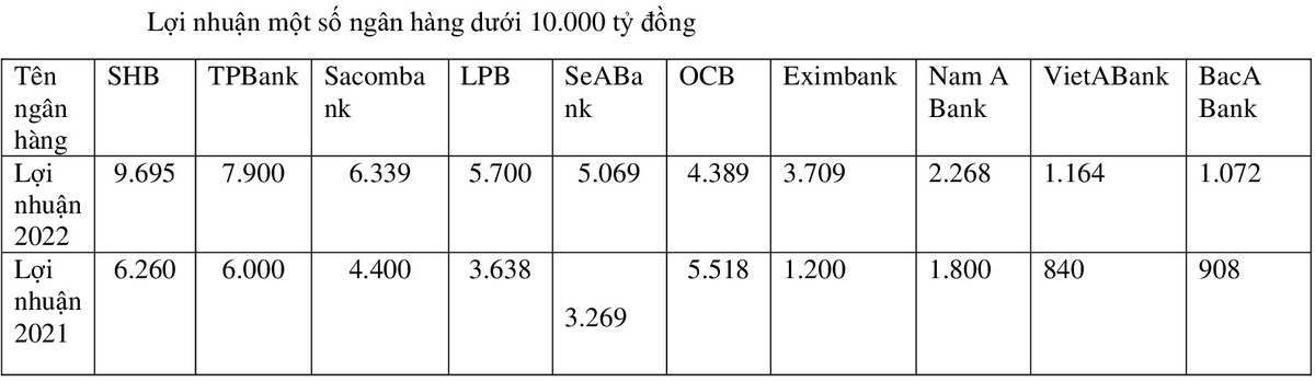 Dù khiêm tốn hơn, nhưng các nhà băng các cũng báo lãi nghìn tỷ với mức tăng trưởng 2 con số trong năm 2022 như Sacombank (6.339 tỷ đồng, tăng 44%), SHB (9.659 tỷ đồng, tăng 54%), TPBank (7.828 tỷ đồng, tăng 30%)...