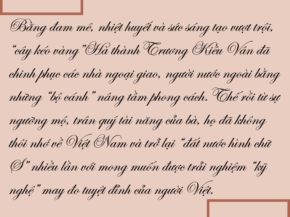 Thế mới hiểu vì sao bà Vân có hẳn danh sách đáng mơ ước những vị khách quen rất đặc biệt là các nhà ngoại giao thuộc các đại sứ quán trên địa bàn Hà Nội. “Cây kéo vàng” Trương Kiều Vân đã trở thành lựa chọn số một của các VIP, khi cần có một bộ trang phục, không chỉ đẹp mà còn thể hiện được cả “phương diện quốc gia”.