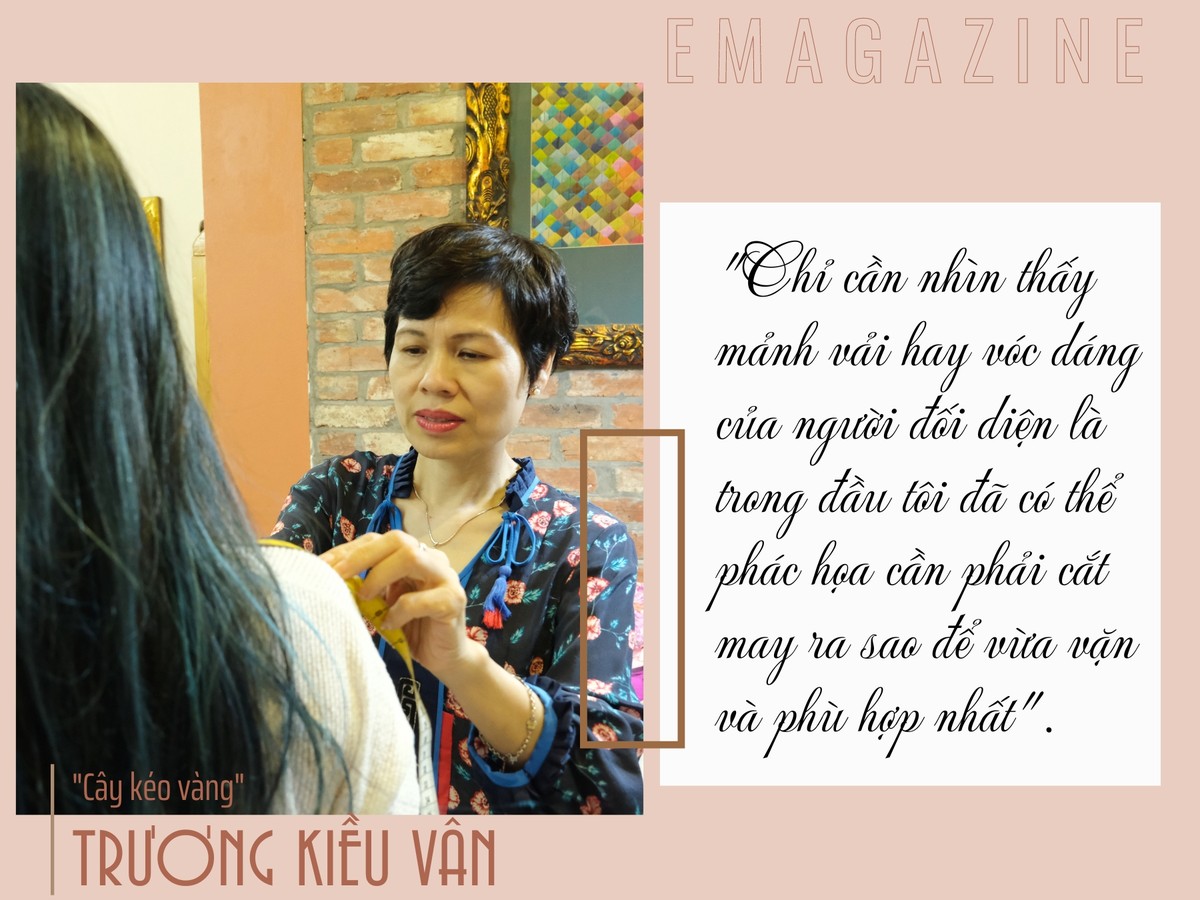 Điều đặc biệt nữa khiến thời trang Vân có hấp lực như thỏi nam châm hút khách hàng là bởi, thông thường một người thợ may sẽ chuyên về dòng thời trang nào đó như: áo dài, complete, váy cưới, trang phục dạ hội, quần áo trẻ em…, nhưng “cây kéo vàng” Trương Kiều Vân nhận may tất cả mọi loại trang phục. Các gia đình người nước ngoài đến với bà sẽ được may đo từ A - Z, cả trang phục cho người già đến trẻ sơ sinh, thậm chí cả trang phục thú cưng.