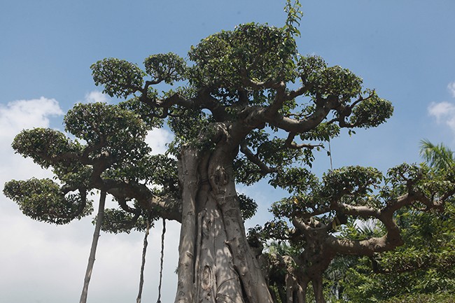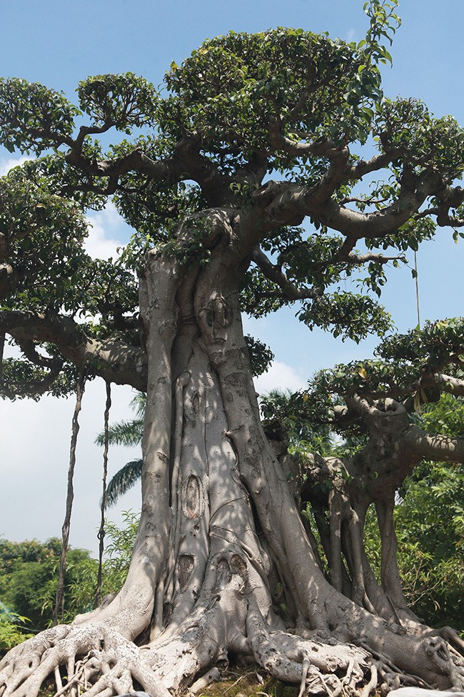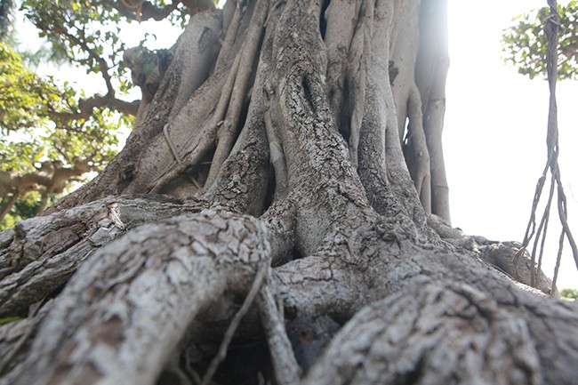 Thân cây vững chãi, bộ rễ lan tỏa xung quanh. Những rễ phụ nối từ cành lớn xuống đất tạo sự cân bằng cho cây.