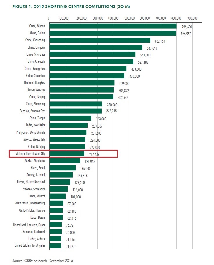 Các thị trường mới nổi ở Đông Nam Á đều có số diện tích trung tâm thương mại hoàn thiện giảm trong năm qua, ngoại trừ Thái Lan và Việt Nam. Tại Việt Nam, các trung tâm mua sắm mới hoàn thiện trong năm 2015 đều ở ngoài khu trung tâm. Mặc dù tỷ lệ diện tích mặt bằng bán lẻ bình quân đầu người vẫn ở mức thấp nhất khu vực châu Á - Thái Bình Dương, tổng diện tích mặt bằng bán lẻ tại TP. HCM vẫn tăng hơn 50% nhờ vào 5 dự án hoàn thiện trong năm trước.