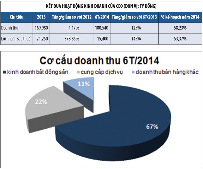 6 tháng đầu năm 2014, doanh thu của CEO chủ yếu đến từ hoạt động kinh doanh cốt lõi là bất động sản và hoạt động cung cấp dịch vụ (bán hàng từ Dự án Sunny Garden City và dịch vụ cho thuê văn phòng tại Tòa tháp CEO), doanh thu khác chiếm tỷ trọng không đáng kể.