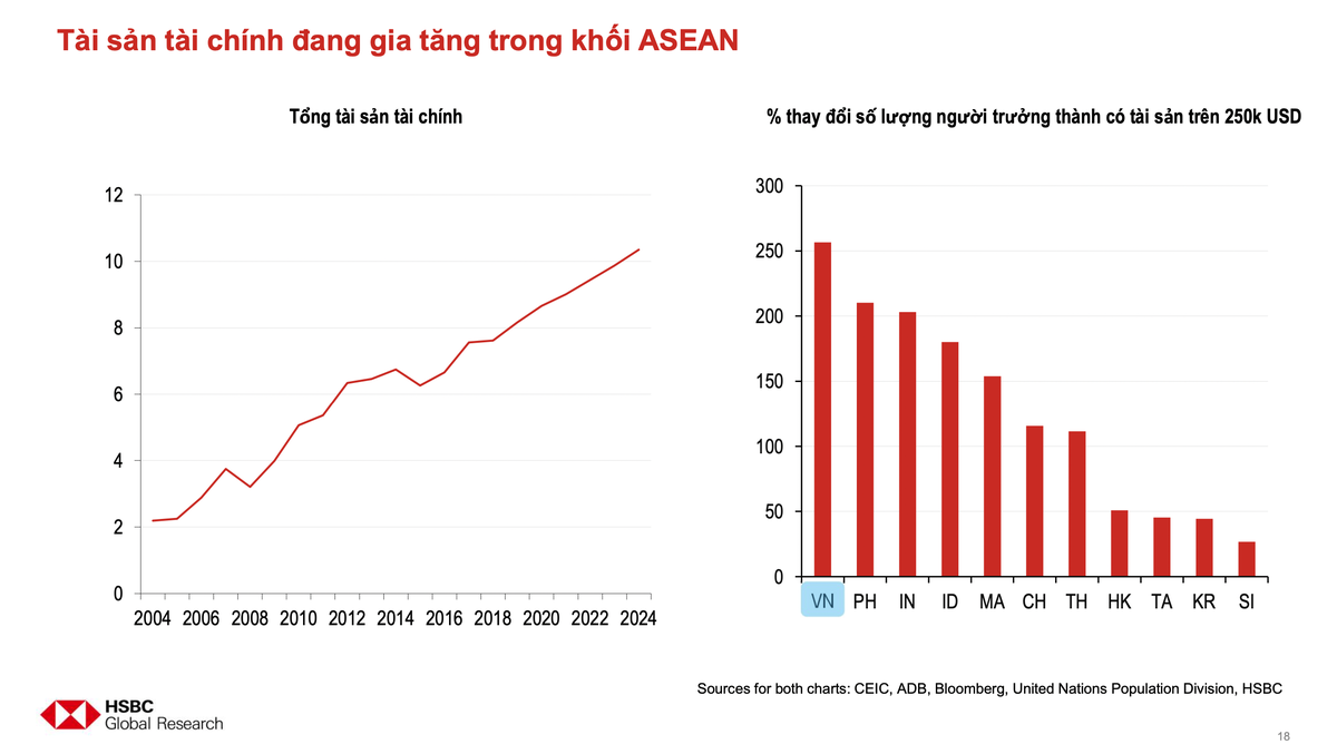 Việt Nam có đặc điểm khác biệt so với các quốc gia khác như nhân khẩu học, văn hóa, kinh tế… trong đó, tỷ lệ dân số ở độ tuổi lao động cao và còn nhiều thời gian để nâng cao kỹ năng lao động cho sự dịch chuyển về nhân khẩu học. Đáng chú ý, Việt Nam đang dẫn đầu khi có lượng gia đình có tài sản cao là tương đối lớn trên 250.000 USD.
