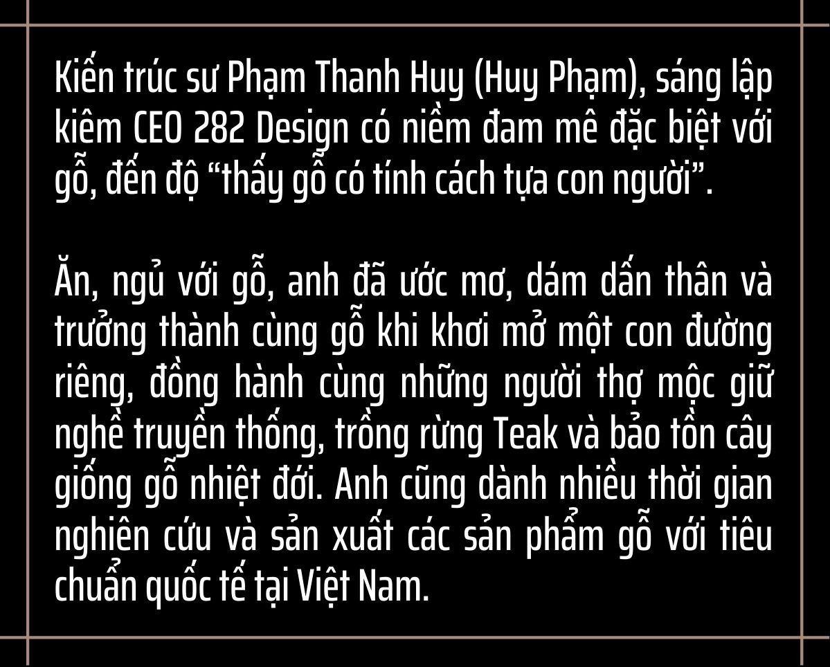 Tôi không lấy yếu tố cá nhân để áp đặt vào công việc, mà lấy tinh thần tập thể xây dựng thói quen. Ở 282 Design, mọi người ăn, ngủ và trưởng thành với gỗ. Mỗi thành viên 282 Design là một người thợ mộc rất yêu nghề. Họ trân quý từng mẩu gỗ nhỏ bởi hành trình trưởng thành với chế tác gỗ là một hành trình gian nan, không có điểm dừng.