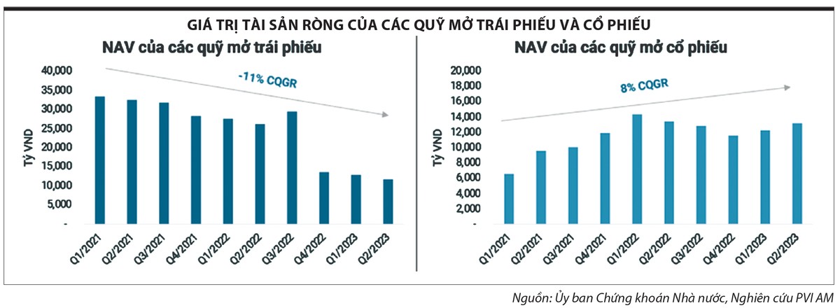 Đối với quỹ trái phiếu, có sự sụt giảm lớn trong năm 2022 - 2023, do ảnh hưởng của hiệu ứng “bond fund run” (đợt rút vốn khỏi các quỹ trái phiếu năm 2022). Diễn biến này xảy ra sau khi thị trường trái phiếu doanh nghiệp có bước phát triển bứt phá những năm trước đó nhưng đối diện nhiều rủi ro, chủ yếu đến từ trái phiếu có liên quan lĩnh vực bất động sản, chứng khoán.