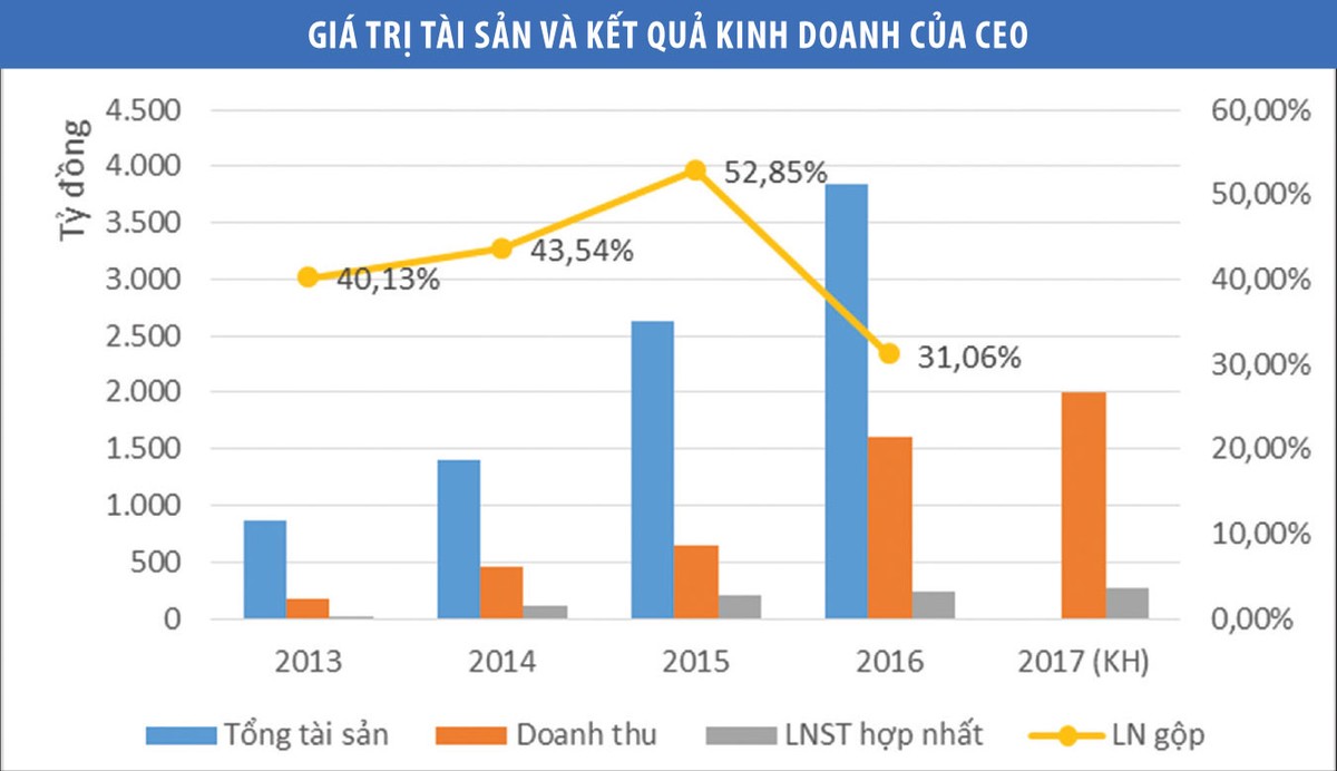 Theo báo cáo tài chính kiểm toán mới được công bố, kết thúc năm tài chính 2016, tổng doanh thu hợp nhất đạt 1.424 tỷ đồng, lợi nhuận sau thuế hợp nhất 230 tỷ đồng, lần lượt vượt 19% và 11,6% kế hoạch đặt ra hồi đầu năm, tăng trưởng 120,4% và 11,8% so với cùng kỳ năm trước. Bên cạnh đó, tổng tài sản của CEO đạt 3.834 tỷ đồng - tăng 46,9%, vốn chủ sở hữu đạt 1.566 tỷ đồng - tăng 44%. Như vậy, chỉ trong vòng 3 năm, từ 2014 đến 2016, tổng tài sản đã tăng 2,75 lần, vốn chủ sỡ hữu tăng 3,36 lần so với năm 2013; doanh thu và lợi nhuận gấp lần lượt 10 lần và 7,92 lần năm 2013.