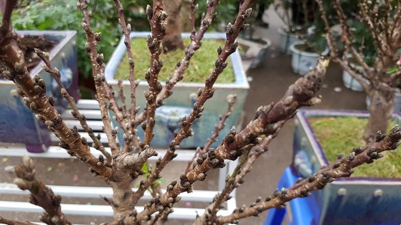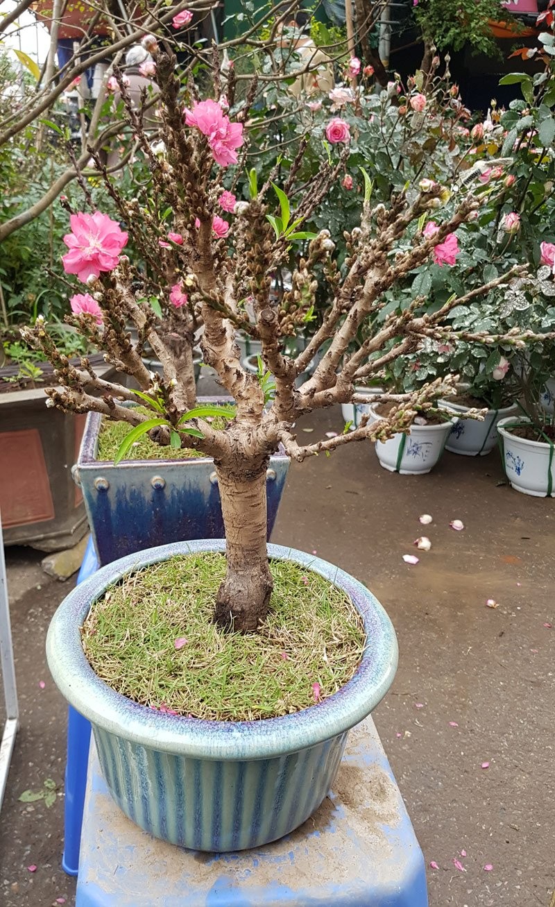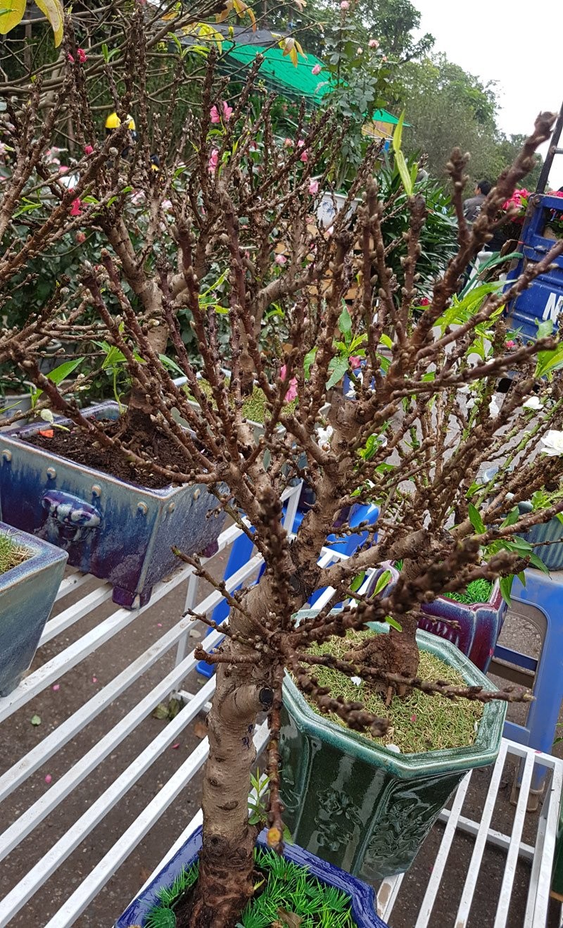 Hình dáng nhỏ gọn có thể đặt gọn ghẽ trên bàn uống nước, những gốc đào này còn được phủ kín nụ từ gốc lên tới tận đầu cành.